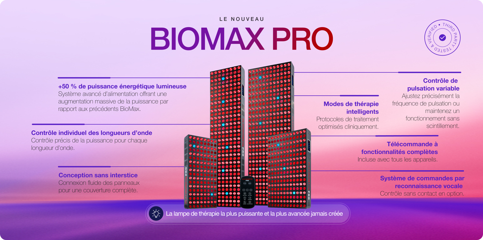 Les lampes de la série BIOMAX sont nos lampes les plus récentes et les plus avancées. Elles ont été développées pour les utilisateurs recherchant une puissance encore plus élevée et un spectre plus étendu pour un bénéfice accru, ainsi que la possibilité de connecter plusieurs panneaux pour créer des panneaux sur mesure. Elles sont également dotées de commandes entièrement numériques avec minuterie intégrée. De plus, toutes les lampes BIOMAX sont compatibles avec nos supports de table et nos supports à roulettes. Les modèles BIOMAX sont disponibles uniquement avec une répartition 50/50 de notre spectre exclusif R+ | NIR+ (brevet en cours) comprenant les cinq longueurs d'onde suivantes : 630 nm/660 nm/810 nm/830 nm/850 nm. Pour plus d'informations sur ce spectre rouge et proche infrarouge exceptionnel, veuillez consulter notre article de blog complet : R+ | NIR+.